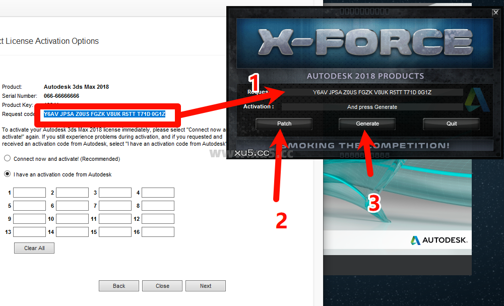 复制申请号(request dode)到注册机,点击patch,再点击generate生成密钥。