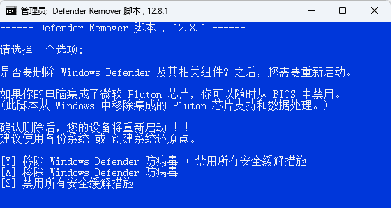 下载以上工具完全禁用系统自带安全中心,如下图。输入“Y”即可,前提是先关闭安全中心及杀毒再执行。因为win11安全中心即使在设置中关闭也会自动拦截,所以唯一解决办法就是彻底关闭